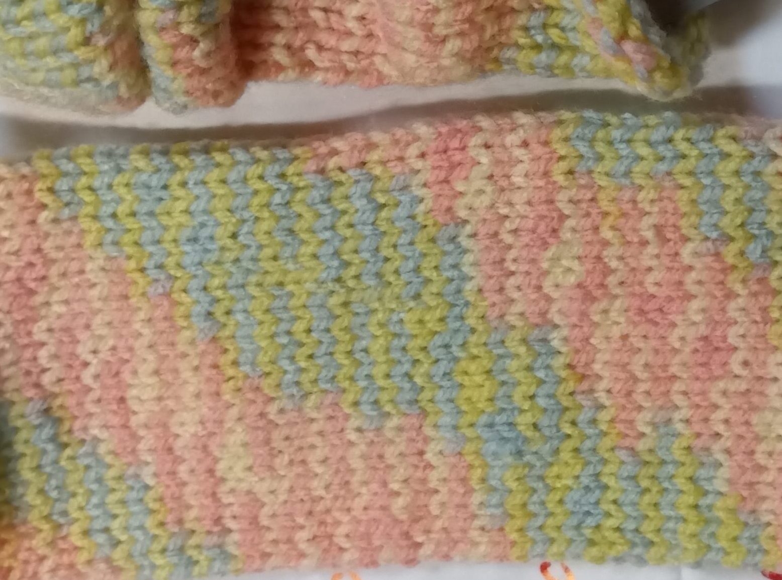 すべて表編みなので簡単でにマーブル編みのレッグウォーマーが完成します。